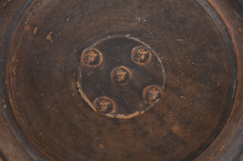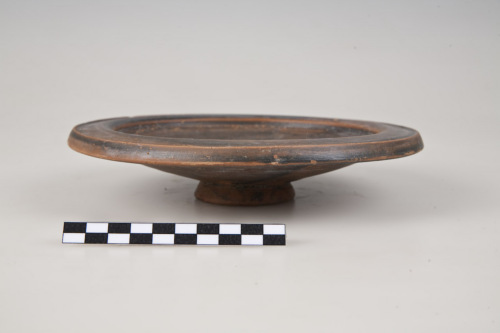 Allinterno della vasca, al centro, decorazione impressa con 5 stampiglie circolari con testa di divinità elmata verso d., a rilievo, tratte probabilmente da un castone di età romano-repubblicana. Le stampiglie sono disposte 4 sugli assi ortogonali e una al centro (Le stesse stampiglie si trovano sulle ciotole IG 13907-13908, IG 13911, dello stesso corredo funerario). Disco di impilamento centrale sottolineato da solcatura circolare.