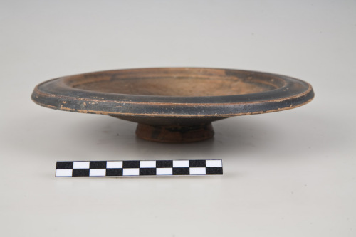 Piatto con labbro a tesa a profilo sinuoso, orlo distinto appiattito e obliquo verso il basso, vasca a profilo esterno troncoconico con lieve carena nella parte superiore, piede ad anello troncoconico, fondo esterno del piede con umbone di tornitura. Allinterno della vasca al centro, decorazione impressa con 5 stampiglie circolari con testa di divinità elmata verso d., a rilievo,tratte probabilmente da un castone di età romano-repubblicana. Le stampiglie sono disposte 4 sugli assi ortogonali e una al centro (Le stesse stampiglie si trovano sullle ciotole IG 13906, 13908, 13911, dello stesso corredo funerario). Disco di impilamento centrale sottolineato da solcatura circolare.
