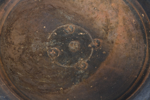 L'argilla è di colore beige-arancio, la vernice è nero-bruna, opaca, molto diluita, in prossimità del piede, tracce di impronte digitali (vernice risparmiata).