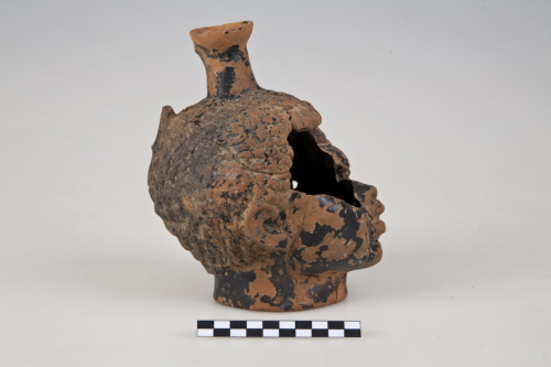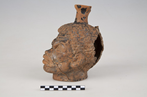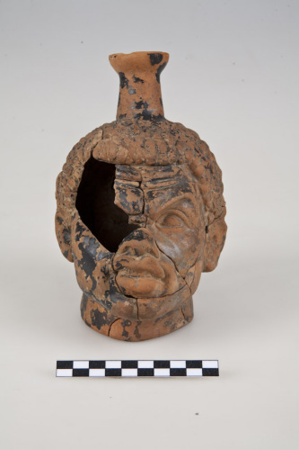Askos con corpo a forma di testa di moro, orlo ad imbuto, collo cilindrico, resti dei due attacchi dellansa impostata verticalmente da sotto lorlo alla spalla (nuca della testa), fondo piatto. La testa ha capelli ricci, fronte corrugata, sopracciglia alzate, naso largo, bocca carnosa, appena aperta, denti e zigomi alti.