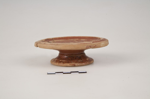 Piattino su alto piede con orlo verticale verso il basso, labbro obliquo, inclinato verso l'esterno, parete interna, convessa, piatto piano. Al centro del piatto, decorazione circolare con due cerchi concentrici incisi che delimitano una rotellatura di trattini obliqui inclinati verso s. Piede a rocchetto con fondo leggermente concavo. Cerchi concentrici incisi sulla psrete esterna e sul fondo esterno del piede, al centro del quale è incisa una N. L'argilla è di colore camoscio, la vernice è rosso-mattone, lucida.