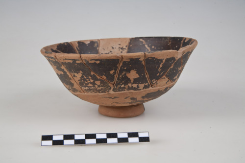 Coppa a profilo sinuoso, carena arrotondata, orlo arrotondato, estroflesso, piede ad anello troncoconico, fondo esterno del piede con umbelico di tornitura. Al centro della vasca, un po decentrato, cerchio rossastro di impilamento.
