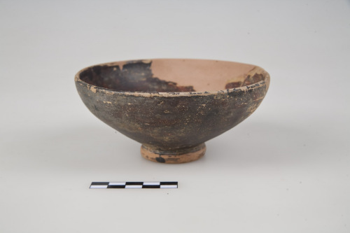 Coppetta a parete emisferica leggermente bombata, orlo rettilineo arrotondato, piede ad anello con profilo verticale, nel fondo esterno, leggero umbone di tornitura, nella vasca interna, cerchio di impilamento rosso-bruno. In prossimità del piede, tracce di impronte digitali. L'argilla è di colore rosata, la vernice è nero-opaca con chiazze rossastre.