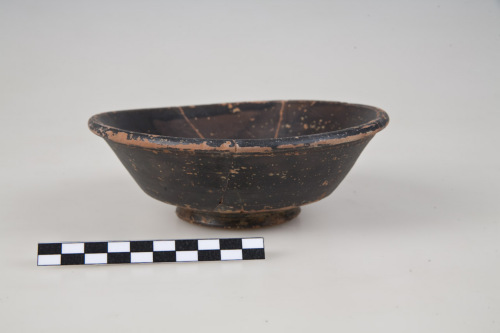 Coppa con orlo arrotondato, ispessito, estroflesso, parete superiore obliqua, carena accentuata, piede ad anello troncoconico, a profilo arrotondato. Tracce di impronte digitali in prossimità del piede.