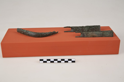 Profonda e curva lama (ligula) con costolature mediane; due manici di forma parallelepipeda, allungata, cavi all'interno, con due sottili protuberanze, all'estremità di una faccia, per permettere il fissaggio con la lama.