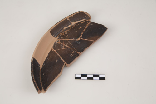 L'argilla è di colore beige scuro, la vernice è nero- bruna, opaca, diluita, macchie rossastre sulla superficie.