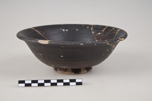 Coppa con ampia vasca profonda a profilo sinuoso, con parte superiore a pareti rettilinee, svasate, e parte inferiore bombata, spesso orlo arrotondato, estroflesso, piede ad anello con profilo troncoconico e spigolo arrotondato, fondo esterno piatto con leggero umbone di tornitura. Allinterno della vasca disco dimpilamento decentrato, a risparmio; sulla superficie esterna della vasca cerchi concentrici di tornitura. Tracce di impronte digitali in prossimità del piede e sul collo.