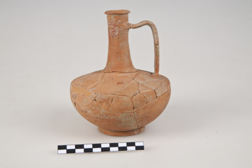 Lagoena con corpo globulare, spalla espansa carenata, lungo collo cilindrico, orlo obliquo, pendente, a base concava, ansa sottile a nastro, con gomito arrotondo appena sopraelevato, impostata, verticalmente, dal collo alla spalla, piede ad anello obliquo, fondo leggermente convesso.