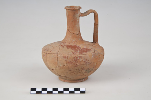 Lagoena con corpo globulare, spalla espansa carenata, lungo collo cilindrico, orlo obliquo, pendente, a base concava, ansa sottile a nastro, con gomito arrotondo sopraelevato, impostata, verticalmente, dal collo alla spalla, piede ad anello obliquo, fondo leggermente convesso. Tracce di tornitura sulla parete esterna.