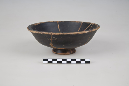 Coppa con orlo arrotondato, appiattito superiormente, espanso allesterno, sottolineato da lieve scanalatura esterna, vasca larga e molto profonda con parte superiore a pareti svasate, parte inferiore con carena leggermente arrotondata, piede ad anello troncoconico a profilo angoloso, leggermente arrotondato, fondo esterno con pronunciato e irregolare umbone di tornitura. Allinterno della vasca, al centro, disco di impilamento rosso-bruno. Sulla parete interna ed esterna marcati segni di tornitura. Tracce di impronte digitali in prossimità del piede e sul piede.