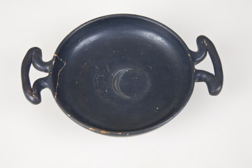 Kylix con anse ad orecchia ripiegate, orlo arrotondato, vasca poco profonda con curvatura in prossimità dell'orlo, piede ad anello a becco di civetta capovolto (con spigolo nel profilo esterno), fondo esterno con appuntito umbone di tornitura, anse ripiegate ad orecchia e impostate subito sotto lorlo. Nella vasca interna decorazione incisa a crudo: 3 cerchi concentrici distanziati, tra i due cerchi più esterni, tre file concentriche di trattini obliqui, irregolari, a rotella, cerchiello inciso al centro della vasca. Al centro della vasca, traccia di disco di impilamento impresso. Tracce di impronte digitali in prossimità del piede e sul piede. Profonde tracce di tornitura sulla parete esterna.