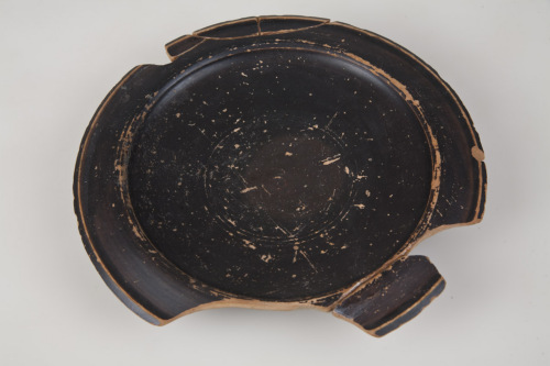 Piatto con labbro a tesa a profilo ondulato (convesso-concavo), orlo assottigliato, obliquo verso lesterno, raccordo bordo-vasca quasi verticale, vasca interna con pareti leggermente concava, piede ad anello, troncoconico a profilo arrotondato, con scanalatura sul battente, fondo esterno con lieve umbone di tornitura. Nella vasca interna, al centro 2 cerchi concentrici incisi, e leggera impressione a spirale, leggero umbone di tornitura, sulla parete esterna, al raccordo bordo-vasca, scanalature. Tracce di impronte digitali in prossimità del piede e sul piede.