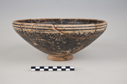 Ciotola con alto orlo arrotondato e inflesso, sottolineato esternamente da 2 scanalature orizzontali, parallele, vasca molto profonda, emisferica, allinterno, due coppie distanziate di cerchi concentri incisi. Piede ad anello con spigolo esterno arrotondato, fondo esterno con lieve umbone di tornitura, sottolineato esternamente, allattacco con la vasca, da una scanalatura circolare, unaltra scanalatura è nel fondo esterno del piede.