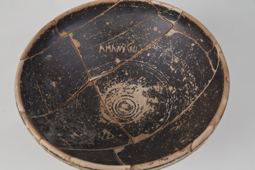 Nella vasca interna, in prossimità dei due cerchi incisi più esterni sono 2 iscrizioni. I iscrizione: graffita, dopo la cottura, tratto regolare poco profondo, ductus destrorso regolare. Si tratta di una formula bimembre maschile, prenome + gentilizio al grado zero. Il prenome viza si ritrova in ambito etrusco. Il gentilizio muliu non presenta confronti in ambito etrusco, ma potrebbe derivare dal prenome venetico molo, connesso con la radice latina molo (macinare) a cui è stato aggiunto il suffisso gentilizio etrusco -iu. II iscrizione: sul lato opposto rispetto alla I, graffita dopo la cottura, tratto poco profondo, segni geometrici o lettere di difficile interpretazione.