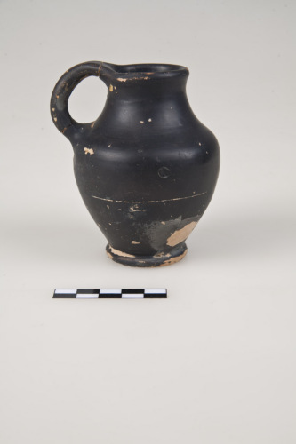 Olpe con corpo ovoide e spalla accentuata, orlo arrotondato, svasato, collo a profilo concavo e distinto, piede ad anello obliquo, distinto e sottolineato da scanalatura, fondo esterno con lieve umbone di tornitura, ansa a bastoncello impostata verticalmente tra orlo e spalla, leggermente sopraelevata. Tracce di impronte digitali in prossimità del piede e sul piede. Allinterno vernice nera fino alla parte inferiore della pancia. L'argilla è di colore beige rosato, la vernice è nero-bluastra, semilucida.