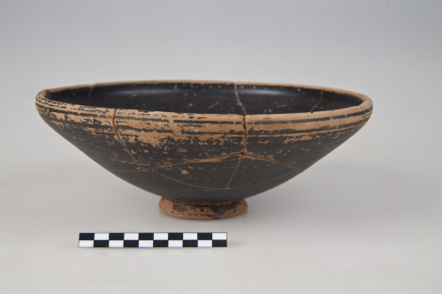 Ciotola con alto orlo arrotondato e inflesso, sottolineato esternamente da 2 scanalature orizzontali, parallele, vasca molto profonda, emisferica, allinterno due coppie distanziate di cerchi concentri incisi. Piede ad anello troncoconico, fondo esterno con lieve umbone di tornitura, irregolare, scanalature e cerchi incisi sulla parete esterna della vasca. Tracce di impronte digitali in prossimità del piede.