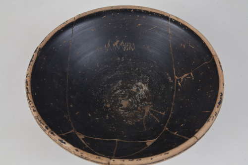 I iscrizione: nella vasca interna, in prossimità dei due cerchi più esterni, graffita dopo la cottura, con tratto regolare poco profondo, ductus destrorso regolare (Viza Muliu); II iscrizione: sul lato opposto rispetto alla prima, allinterno della fascia compresa tra i cerchi incisi, lettera graffita dopo la cottura, con tratto irregolare profondo (khi); III iscrizione: nella parete esterna, in prossimità dell'attacco del piede, lettera grsffita dopo la cottura, con tratto regolare poco profondo, ductus incerto (l sinistrorso oppure p destrorso).