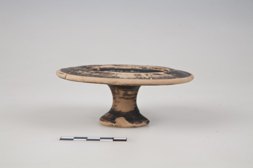 Piattello su alto piede, labbro a tesa orizzantale a profilo ondulato, orlo arrotondato, vasca con breve raccordo con il bordo quasi verticale e pareti orizzontali, piede con alto stelo cilindrico e strombato, cavo allinterno, con umbone di tornitura; raccordo tra vasca e orlo sottolineato da una scanalatura circolare, al centro, cerchio impresso.