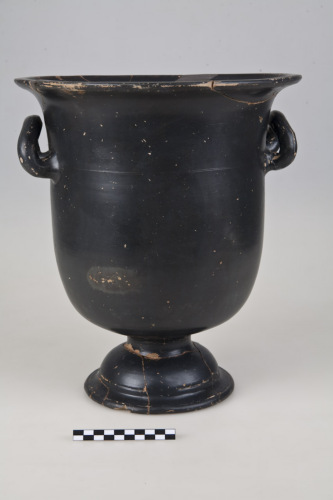 Cratere a campana con orlo ingrossato, appiattito superiormente, labbro estroflesso, corpo a campana molto allungata, alto e ampio piede modanato, cavo internamente e con breve stelo troncoconico rastremato verso l'alto, robuste anse a bastoncello, impostate orizzontalmente sotto lorlo e ripiegate allinsù fin quasi a rientrare. Cerchio inciso in corrispondenza dellattacco inferiore delle anse, scanalature circolari sul piede.