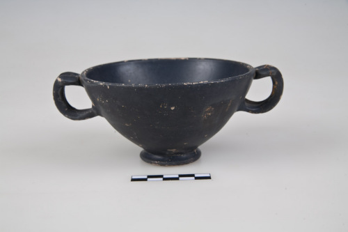 Coppa con anse bifide, orlo arrotondato, vasca emisferica, profonda, con pareti convesse, piede ad anello obliquo con spigolo esterno arrotondato, fondo esterno con lieve umbone di tornitura, anse a doppio bastoncello che si dividono allattacco superiore, formando un anello quasi triangolare, impostate verticalmente tra orlo e vasca. Leggero umbone centrale nella vasca interna, tracce di impronte digitali in prossimità del piede e sul piede. L'argilla è di colore beige rosata, la vernice è nero-bluastra, opaca, liscia, coprente, con chiazze grigiastre sulla superficie.