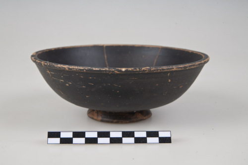 Coppa con orlo arrotondato, appiattito superiormente, espanso allesterno e sottolineato allesterno da scanalatura, vasca larga e profonda con parte superiore a pareti svasate, parte inferiore con carena leggermente arrotondata, piede ad anello troncoconico a profilo arrotondato, fondo esterno con lieve umbone di tornitura. Fondo della vasca concavo e al centro, disco di impilamento bruno-chiaro. Scanalature orizzontali, circolari sulla parete esterna, sotto lorlo. Tracce di impronte digitali in prossimità del piede e sul piede.