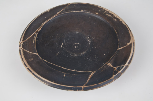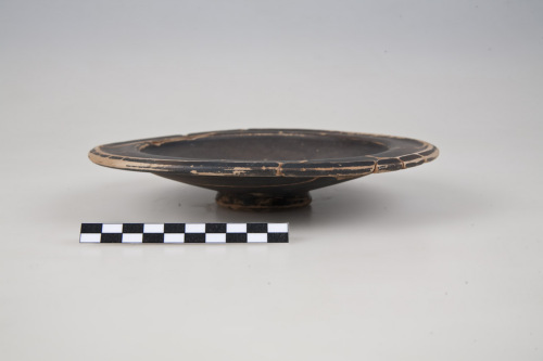 Piatto con labbro a tesa a profilo ondulato (convesso-concavo), orlo appiattito e obliquo verso lesterno, raccordo bordo-vasca quasi verticale, vasca interna poco profonda e leggermente concava, piede troncoconico a profilo arrotondato, fondo esterno con umbone di tornitura. Nella vasca interna, al centro, 4 cerchi concentrici incisi: due più esterni ravvicinati, due in prossimità del centro, distanziati dagli altri. Proprio al centro della vasca cerchietto impresso e piccolo umbone di tornitura. Sul labbro nella parte esterna, scanalature circolari. Tracce di impronte digitali in prossimità del piede e sul piede.