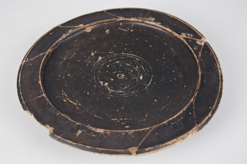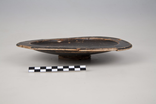 Piatto/coperchio con labbro a tesa a profilo ondulato (convesso-concavo), orlo appiattito e obliquo verso lesterno, raccordo bordo-vasca quasi verticale, vasca interna poco profonda e leggermente concava, piede ad anello, obliquo, fondo esterno con lieve umbone di tornitura. Nella vasca interna, al centro, 3 cerchi concentrici incisi e piccolo cerchio centrale inciso. Tracce di impronte digitali in prossimità del piede e sul piede.