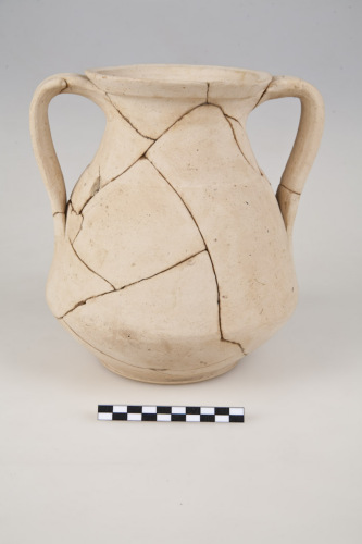 Pelike con accentuata carena nella parte inferiore, orlo a fascia superiormente appiattito con lieve incavo, labbro svasato, collo a profilo concavo, sottolineato inferiormente da una risega, piede a disco piatto, anse a nastro con lieve costolatura mediana, impostate verticalmente sotto lorlo e sulla pancia. L'argilla è di colore beige giallino con piccoli grani di chamotte ed inclusi calcarei e micacei.