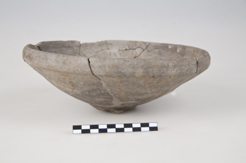 Mortaio con orlo esternamente ingrossato, ripiegato verso linterno, a sezione sub triangolare, ampia e profonda vasca con pareti convesse, piede forse ad anello, sul fondo interno, pochi inclusi ferrosi costituenti la grattugia, sulla parete esterna, scanalatura orizzontale.