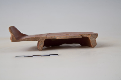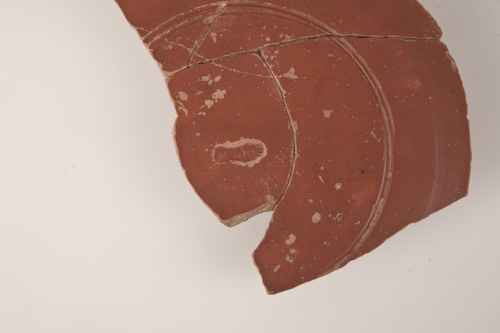 Frammento di fondo di piatto con alto orlo arrotondato con parete verticale a profilo convesso-concavo, vasca rettilinea orizzontale, piede ad anello troncoconico, a profilo angoloso, allinterno della vasca, al centro, coppia di cerchi concentrici incisi, allinterno dei quali, al centro, è il bollo integro su riga unica in planta pedis destra AGATO. Cerchi concentrici incisi sulla parete esterna e sul fondo esterno del piede. Tracce di impronte digitali sul fondo, sul piede e nella vasca interna.