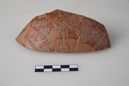 Frammento di coppetta di Sarius con parete del corpo convessa, decorazione a matrice: alternanza di colonnine a tortiglione con base e capitello decorati e di colonnine a scanalature verticali, decorate nella parte superiore del fusto da cerchio puntato; dai capitelli fuoriescono foglie di acanto. Le colonnine si trovano su piani sfalsati: quelle a tortiglione più in alto le altre più in basso. L'argilla è di colore arancio, la vernice è rosso-bruna, compatta, lucida.