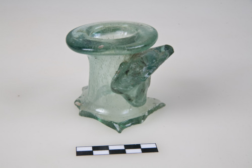 Frammento di parte superiore di bottiglia con largo orlo orizzontale ribattuto, collo cilindrico a pareti rettilinee, ansa a nastro, attaccatura superiore, parete svasata.