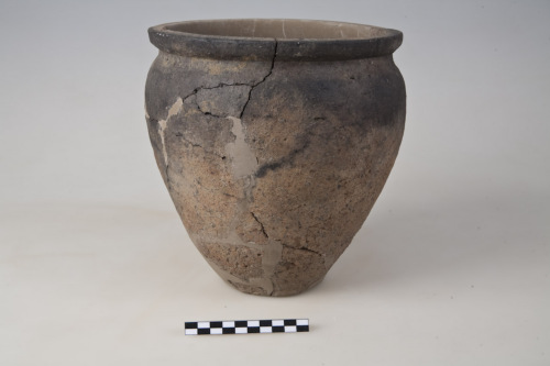 Olla con corpo ovoide, molto rastremato verso la base, orlo ispessito con labbro orizzontale, leggermente concavo, breve collo a profilo concavo e leggera carenatura alla base, fondo piatto, allinterno profonde tracce di tornitura e umbone.