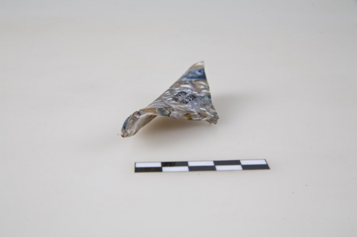 Frammento di orlo estroflesso a bordo arrotondato di spesso vetro a mosaico, fondo color ambra punteggiato di bianco, azzurro-grigio, marrone, blu, opalescente. Questo tipo di vetro è diffuso in particolare in tutto il Nord Italia e in Emilia, in Veneto probabili centri di produzione sono Aquileia e Adria. Il vetro a mosaico di età romana deriva da quello di età ellenistica. In Veneto i contesti nei quali si ritrova sono databili tra fine I a.C. e fine I d.C.