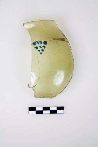 Frammento di parete con parte di orlo e di fondo di bicchiere "nuppenbecher" con corpo conico, breve orlo ricurvo verso linterno tagliato e levigato, fondo piatto, decorazione a rilievo sulla parte superiore della parete, sulla spalla, costituita da gocce di vetro blu disposte a triangolo equilatero con il vertice rivolto in basso e 4 gocce per lato. In prossimità di questa decorazione è una applicazione color argento a forma di punta lanceolata.