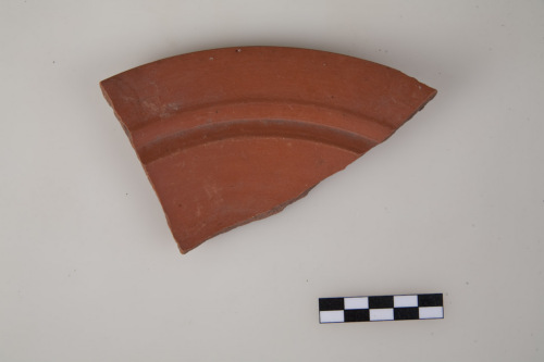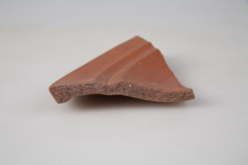 Frammento di patera/scodella in terra sigillata africana D, parete espansa a profilo convesso con fondo della vasca interna piatto, orlo ad andamento spezzato, costituito da due parti: una più esterna con labbro ingrossato a sezione sub triangolare, pendente verso il basso e una più interna unita alla precedente a spigolo vivo, sottolineato da un listello poco rilevato, e avente andamento angolare. Lorlo è unito alla parete a spigolo vivo ed è inclinato verso linterno.