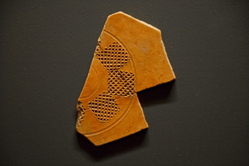 Frammento di fondo di patera in terra sigillata africana D, con fondo piano al centro del quale è una decorazione impressa a stampo, entro una fascia circolare delimitata da 2 solcature incise, costituita da graticciati quadrati disposti a raggera, toccantisi con i vertici inferiori, allinterno il graticcio è diagonale.