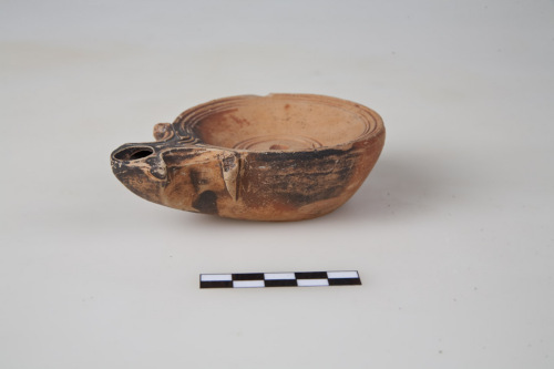 Lucerna a doppie volute, a becco triangolare, a canale chiuso, spalla a bordo esterno parallelo al fondo, fondo piatto con piede ad anello rilevato. Il disco è a pareti concave, superiormente alla spalla, 3 solcature concentriche, al centro del disco, 2 solcature concentriche, 3 fori: infundibulum, al centro del disco, foro di sfiato, sulla spalla, allattacco del becco, foro di bruciatura, allestremità del becco. Tracce di uso sul becco e sul serbatoio.