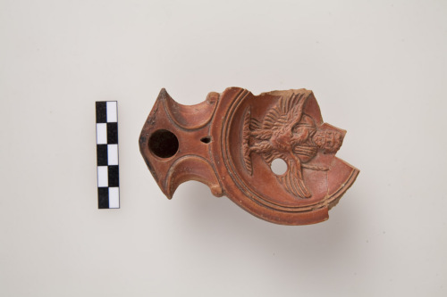 Lucerna a doppie volute, a becco triangolare, a canale chiuso, spalla piatta con 2 profonde solcature, al centro del disco, in rilievo, decorazione raffigurante busto di Giove di prospetto con scettro nella s., davanti a lui aquila di prospetto con testa verso s. ad ali spiegate e posata su fulmine, foro di alimentazione decentrato, foro di sfiato allattacco del beccuccio. Tracce duso sulla punta del beccuccio.