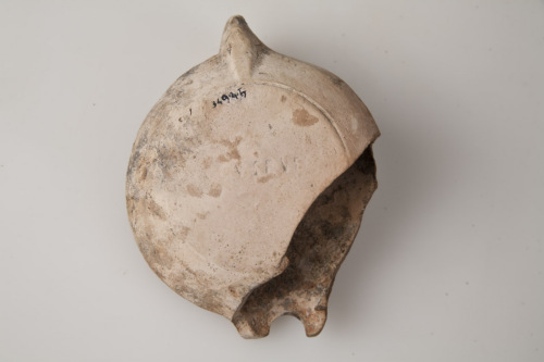 Lucerna a disco con ansa ad anello, sulla spalla decorazione a rilievo con motivo di girali di tralci e viticci a lavorazione sommaria, spalla pendente verso lesterno e separata dal disco da nervatura circolare in rilievo, serbatoio a sezione triangolare con spigolo curvilineo, foro di alimentazione sul disco, decentrato, resto ca. la metà del foro di bruciatura con tracce di uso, foro di sfiato in prossimità della nervatura del disco. Becco delimitato allattacco da un solco orizzontale diritto. Fondo piatto sottolineato da scanalatura, al centro tracce del marchio in negativo: COSSEVE (?).