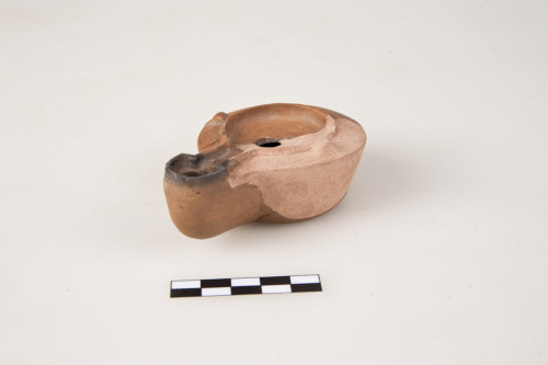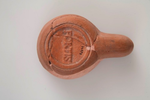 Lucerna "firmalampen" a canale aperto, serbatoio troncoconico con spalla lievemente spiovente, due borchiette piramidali sulla spalla, disco piatto ribassato con foro di alimentazione decentrato, foro di sfiato, al centro del canale, tracce di uso sul foro di bruciatura, fondo piano lievemente ribassato delimitato da un anello con bordi scanalati, al centro, bollo FORTIS, lettere rilevate e apicate. L'argilla è di colore rosso-arancione.