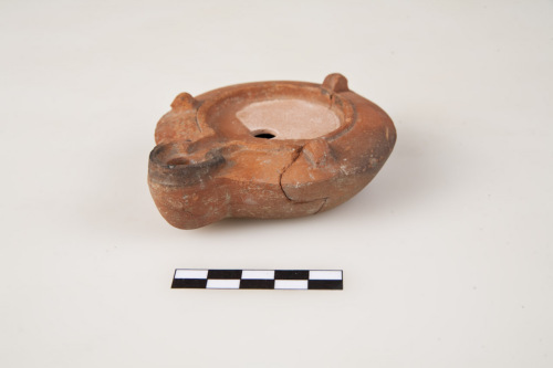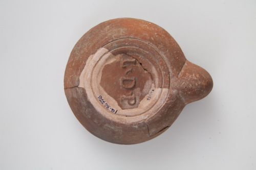Lucerna "firmalampen" a canale aperto, serbatoio troncoconico con spalla lievemente spiovente, sulla spalla, 3 borchiette piramidali con incisione superiore, disco piatto ribassato con foro di alimentazione decentrato, foro di sfiato, al centro del canale, tracce di uso sul foro di bruciatura, fondo piano lievemente ribassato delimitato da 2 anelli, al centro, il marchio LDP, lettere rilevate e apicate.