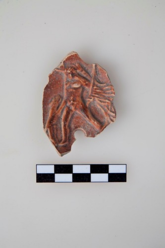 Frammento di disco figurato rappresentante Atteone assalito da un cane: Atteone stante verso s. con lancia nella s., braccio d. sollevato armato del pedum nellatto di difendersi dal cane che lo assale, clamide svolazzante poggiata sul braccio s.