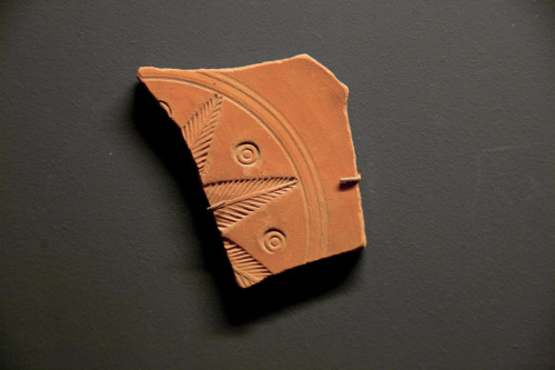 Frammento di fondo di patera in terra sigillata africana D, fondo piano, decorazione impressa a stampo sul fondo centrale del piatto, delimitata da due cerchi concentrici incisi e costituita da parte superiore di 3 foglie di palma stilizzate, alternate a 2 cerchielli concentrici.
