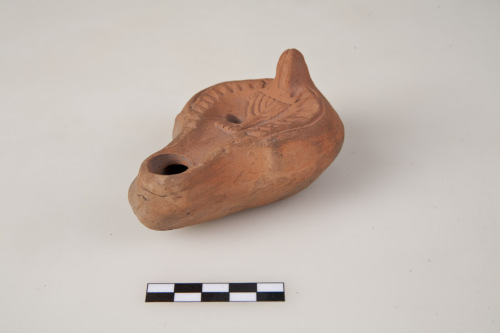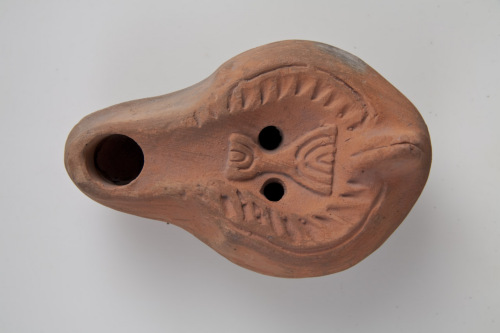 Lucerna c.d. africana o cristiana con serbatoio biconico, carenato, ansa triangolare, piena, verticale, con incisione longitudinale superiore, spalla piatta delimitata da scanalatura con decorazione a tacche trasversali profondamente incise, al centro del disco, un candelabro a 7 braccia, a rilievo, al centro, ai lati dello stelo del candelabro, 2 fori di alimentazione, canale aperto con ampio foro di bruciatura, fondo leggermente concavo delimitato da scanalatura che continua sul serbatoio verso la presa diramandosi in 3 scanalature parallele.
