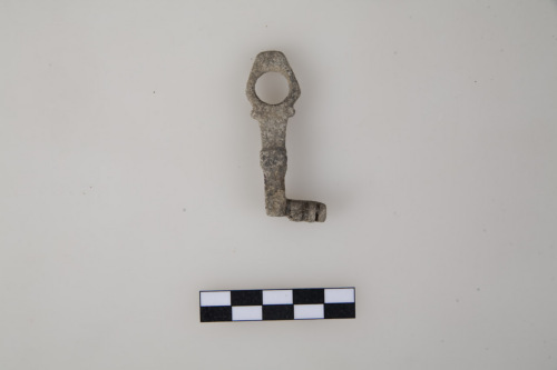 Chiave a scorrimento con stelo a sezione rettangolare rastremato in fondo, impugnatura ad anello circolare e profilo esterno romboidale, delimitata alla base da 2 piccoli apici laterali ad una estremità a profilo triangolare, a metà dello stelo, risega rettangolare con funzione di fermo-corsa, mappa (ingegno) formata da tre denti, quello più interno è tagliato obliquamente a metà.