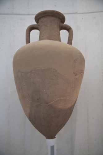 Anfora vinaria, tipo con orlo ad echino, corpo a trottola, spalla espansa, breve collo cilindrico a profilo imbutiforme, puntale corto, cilindrico, anse distanziate dal collo con gomito arrotondato, impostate subito sotto lorlo e sulla spalla.