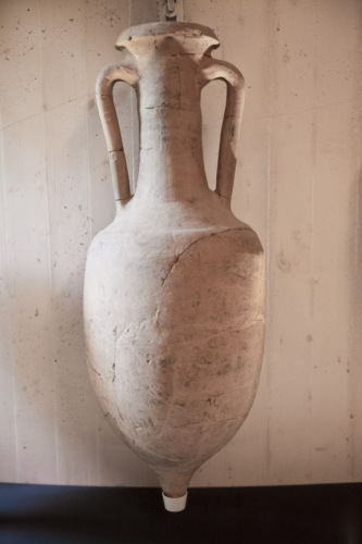Anfora vinaria di tipo greco-italica con orlo a sezione triangolare, pendente, a base concava, lungo collo cilindrico, corpo a profilo ovoide, sfinato verso il fondo, spalla espansa, sottolineata da uno spigolo, lungo puntale cilindrico, pieno, anse lunghe con gomito arrotondato. Sui gomiti delle anse, 2 bolli in cartiglio rettangolare: SALVI