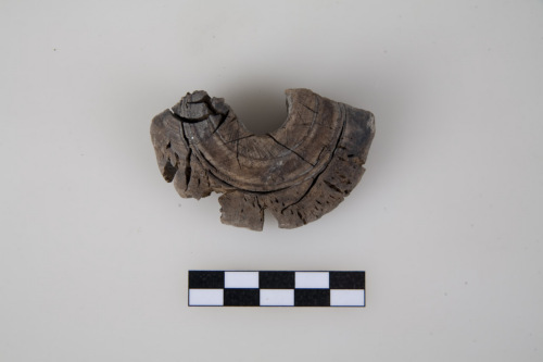 Elemento di arredo, forse per mobile, di forma semicircolare con semiforo centrale, fondo piano e superficie superiore leggermente bombata, decorati entrambi da tre semicerchi concentrici incisi, sulla parte superiore i due più esterni ravvicinati, sul fondo i due più interni ravvicinati, bordo irregolare. Colore del legno nocciola scuro con tracce di nero forse dovute al fuoco.