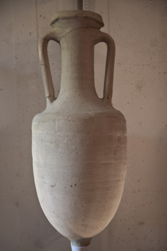 Anfora vinaria di tipo greco-italico con orlo a sezione triangolare, a fascia, distinto dal collo, lungo collo cilindrico, spalla espansa sottolineata da uno spigolo, corpo a profilo ovoide, sfinato verso il fondo, puntale pieno, anse lunghe, con gomito arrotondato, dal profilo obliquo. Due bolli in cartiglio rettangolare, su ciascun gomito delle anse, non ben leggibili: NAI [-] o anche forse MVA[-]